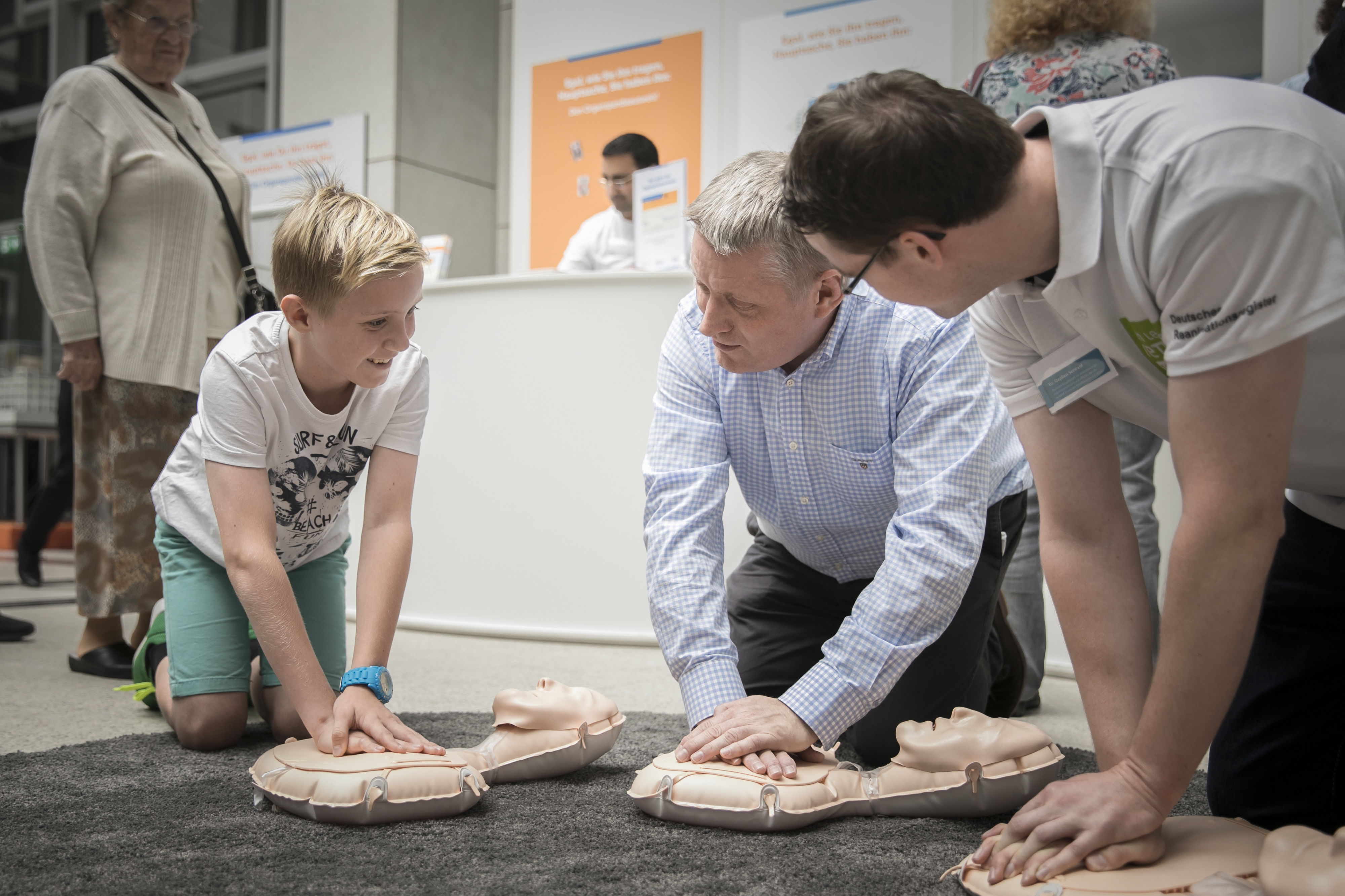 Auf der Bühne fanden Übungen zur Herzdruckmassage unter fachkundiger Leitung des Anästhesieteams des Instituts für Rettungs- und Notfallmedizin Kiel statt. Auch Bundesgesundheitsminister Hermann Gröhe zeigte auf der Bühne, wie man bei einem Herzstillstand zum Lebensretter wird.